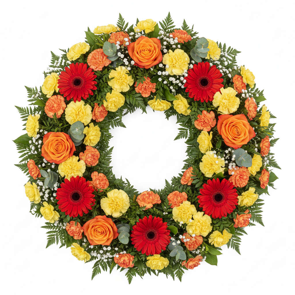 Coroa Calor Eterno – Gérberas Laranja, Cravos Pêssego e Rosas Brancas