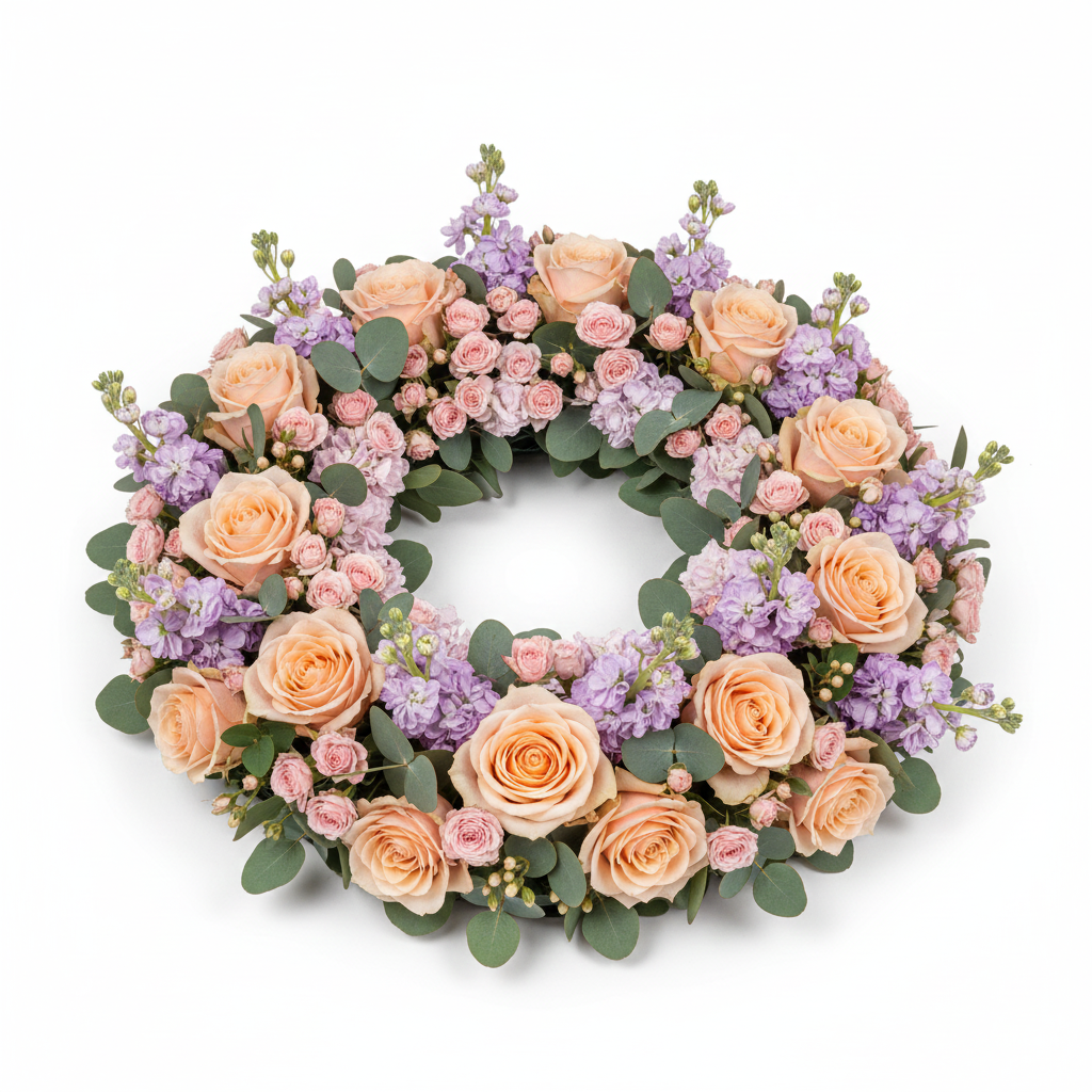 Rosas pêssego, spray roses rosa e stock lilás. Coroa em 3 tamanhos à escolha, 80cm, 100 cm e 120cm.